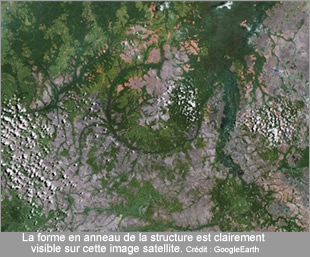 La structure en anneau repérée au centre de la République démocratique du Congo s’étend sur 36 à 46km de largeur. Elle domine le terrain alentour d’une cinquantaine de mètres et est entourée par la rivière Una qui souligne sa courbe. Cette structure pourrait résulter de la chute d’un astéroïde de 2 km de diamètre, voici quelque 60 millions d’années.
